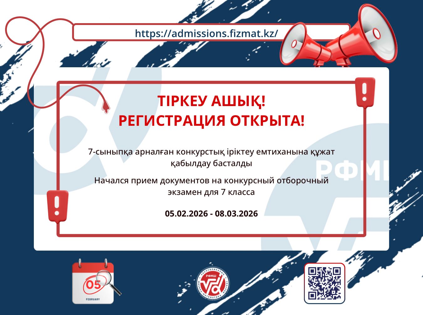 Құрметті үміткерлер! Республикалық физика-математика мектебінің (РФММ) 7-сыныбына қабылдау конкурстық іріктеу емтиханы арқылы жүзеге асырылады. Емтиханға тіркелу тәртібі https://admissions.fizmat.kz/ сайтына кіріңіз «Қалай түсуге болады?»…