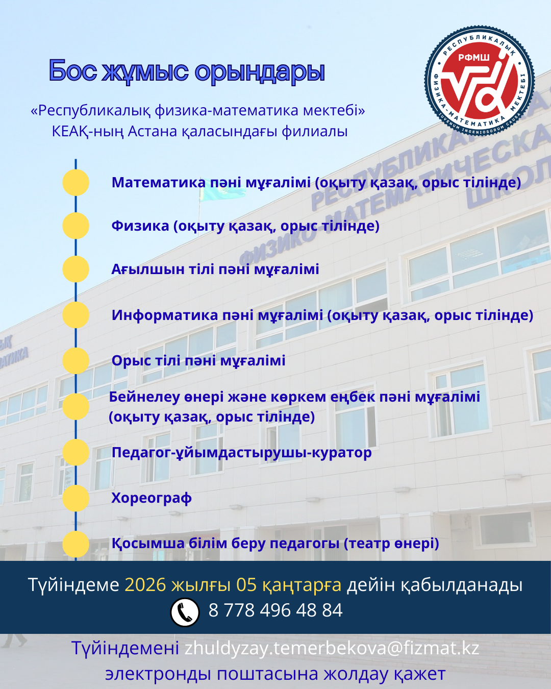 «РФММ» КеАҚ Астана қаласындағы филиалы бос лауазымдарға арналған іріктеу конкурсын жариялайдыТіркелуге арналған сілтеме:https://docs.google.com/forms/d/e/1FAIpQLSffGzxbqMO_iYVP27ew3p3naEzNpyD4UnuZpTksywp1tL09cg/viewform?usp=header